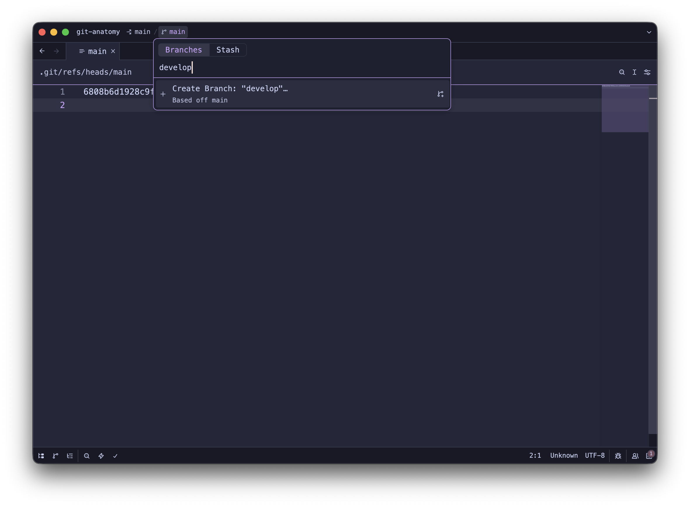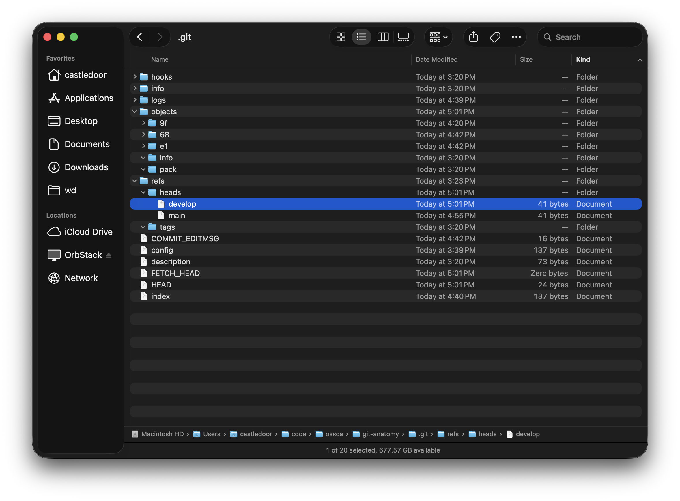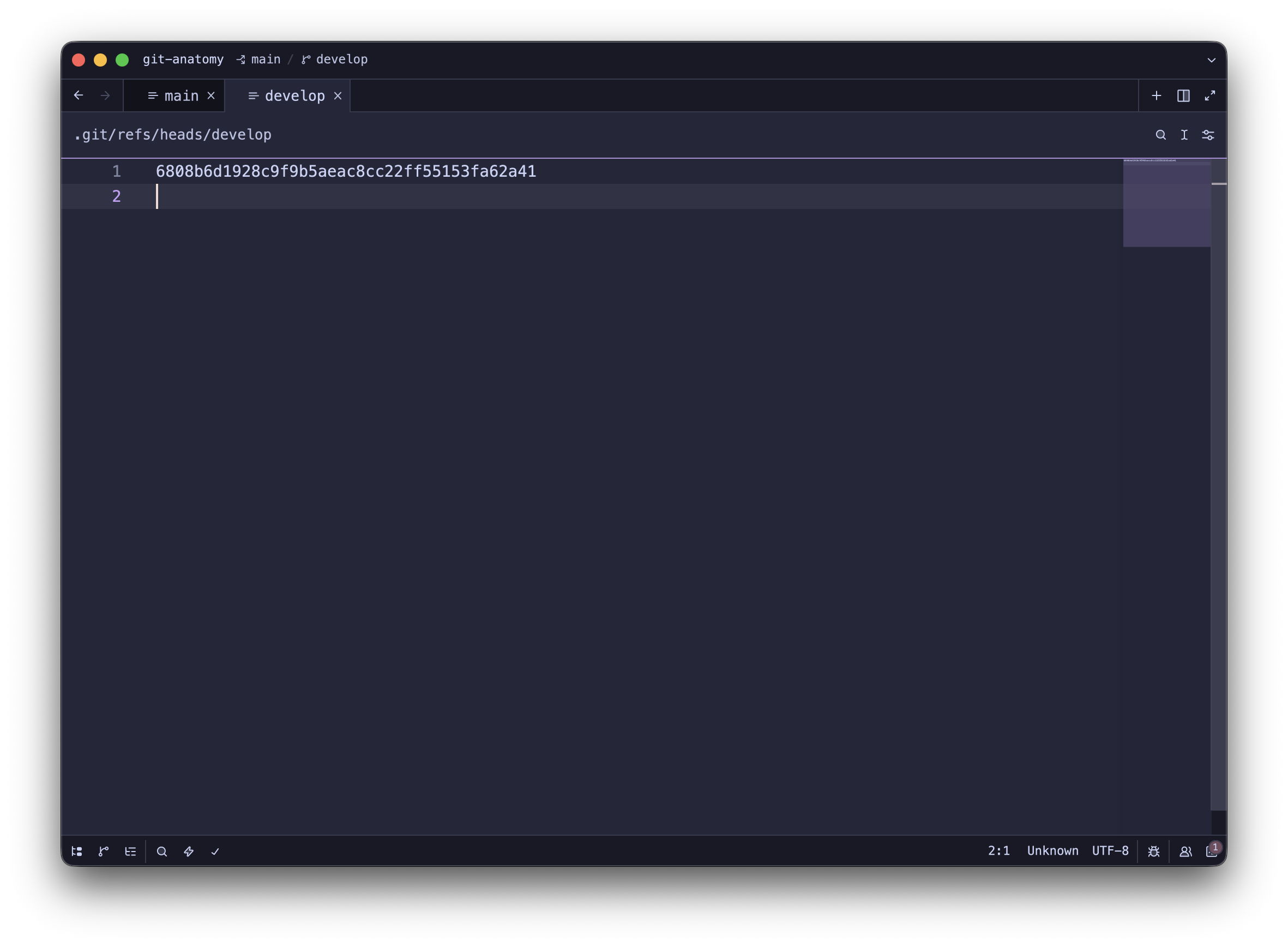 main 브랜치로부터 develop 브랜치를 새로 만들게 되면 .git/refs/heads 안에 develop이라는 이름의 파일이 생성되는데, main 파일과 동일한 커밋 해시값이 들어있는 것을 확인할 수 있다