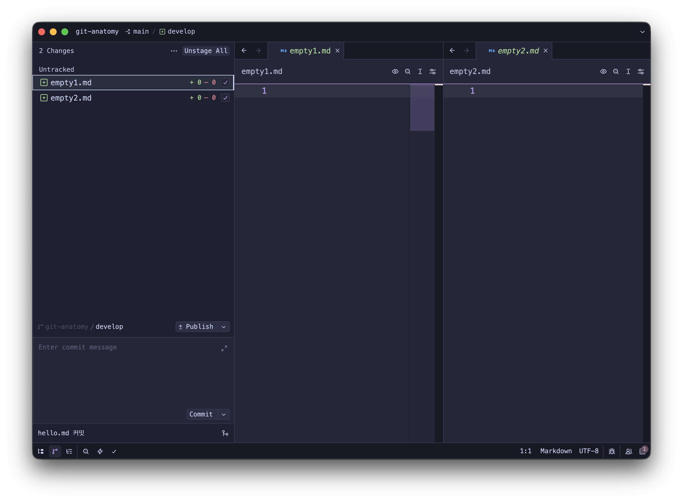 create mode 100644 empty2.md지금은 merge conflict가 없어서 간단하게 merge 가능