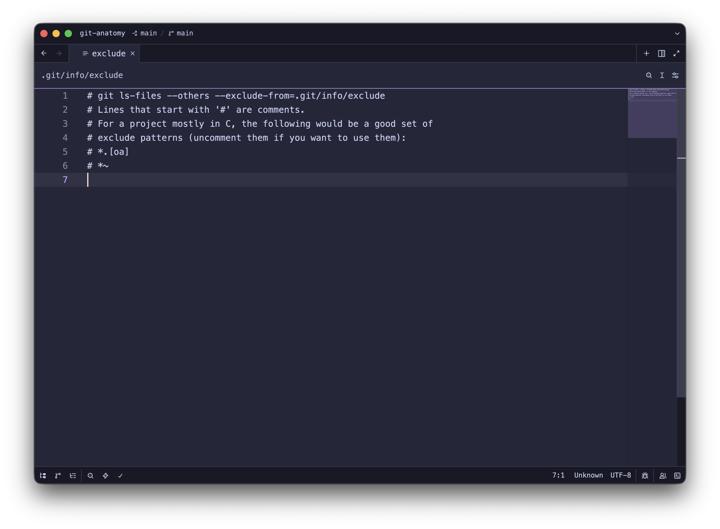 .git/info/exclude 파일은 .gitignore 파일과 동일한 패턴 매칭 문법을 사용해 git에서 특정 파일들을 추적하지 않도록 할 수 있다
